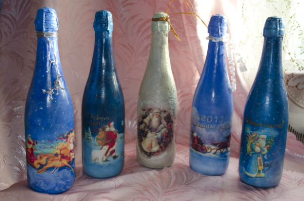 в работе использованы материалы:распечатки, краски акриловые, лак глянцевый, лак матовый Поли Р, глитер,манка (на последней фото видно), шпаклевка и кружево(вторая бутылка),контур.