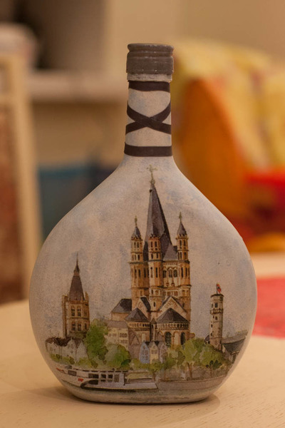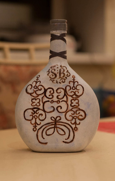 5. Обратная сторона. Нанесла контуром рисунок, затем промазала битумом и зафиксировала лаком (пыталась и очень старалась научиться работать с ним, но пришла к выводу, что, наверное, битум хорошо смотрится только на стекляной поверхности). Рисунок решила нанести, потому что мотив никакой из имеющихся у меня не подходил из-за выпуклых букв на бутылке, а сделать распечатку не позволил сломаный компьютер.