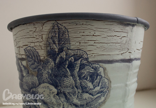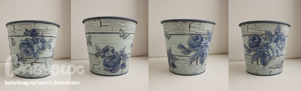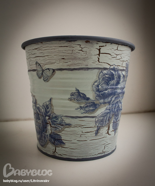 Ошкурила кашпо крупной шкуркой, загрунтовала универсальным грунтом, верхнюю и нижнюю части покрасила коричневой краской, середину белой. На коричневую краску нанесла лак для кракелюра и оставила до полного высыхания, чуть больше часа. Затем намешала светлую краску (белый с бирюзовым и черным) и хорошенько развела водой (в этом была изначальная проблема, из-за густоты краска отказывалась растрескиваться напрочь). Эту жидкую краску кистью нанесла поверх лака и в середине. Потом приклеила салфеточный мотив на разведенный ПВА. Прошлась обычным лаком для закрепления. Нарисовала каемки и тени. И еще раз все залачила.