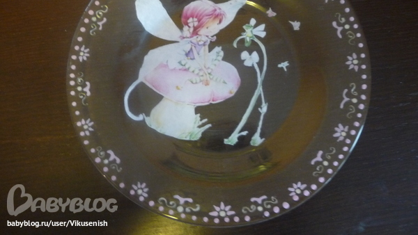 - нанесла контурами (розовый и жемчужный) рисунки по краю тарелки