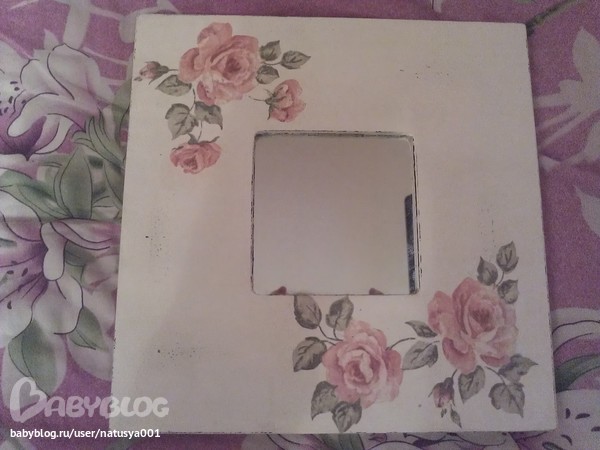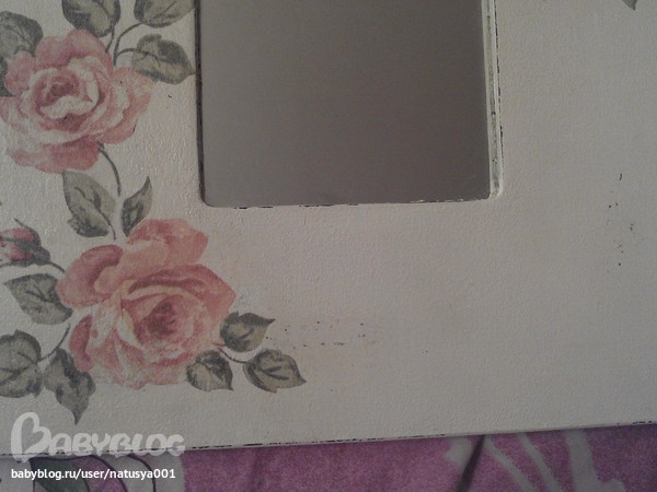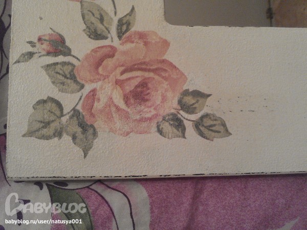 ход работы: заготовку прошкурила, загрунтовала, покрасила коричневой краской, натерла свечей некоторые места, покрасила бледно-бледно розовой краской, прошкурила месте которые свечей были натерты, приклеила салфетку.