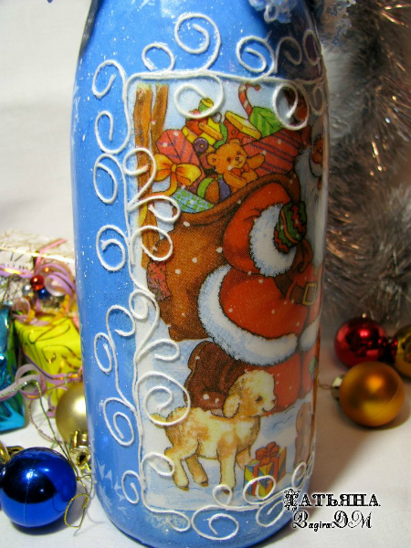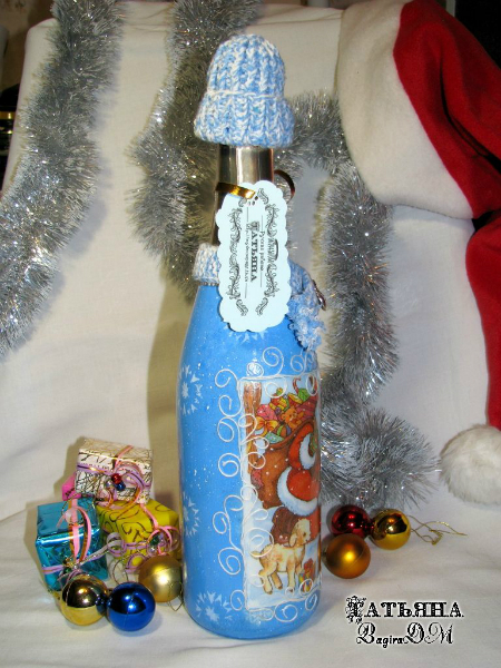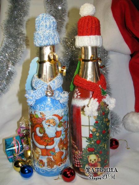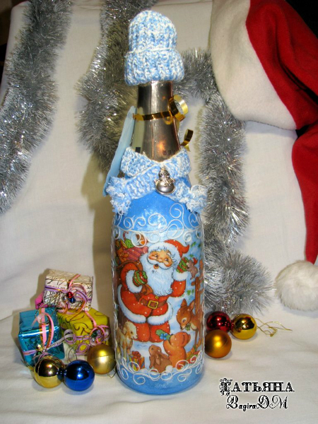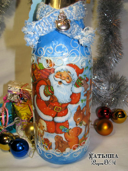 Материалы: бутылки с шампанским, салфетки, акриловые краски, акриловый лак, ниточки и клей ПВА для голубой бутылочки, контуры красный, золотой, зеленый и глитеры в форме звездочек для елочки на красной бутылке.