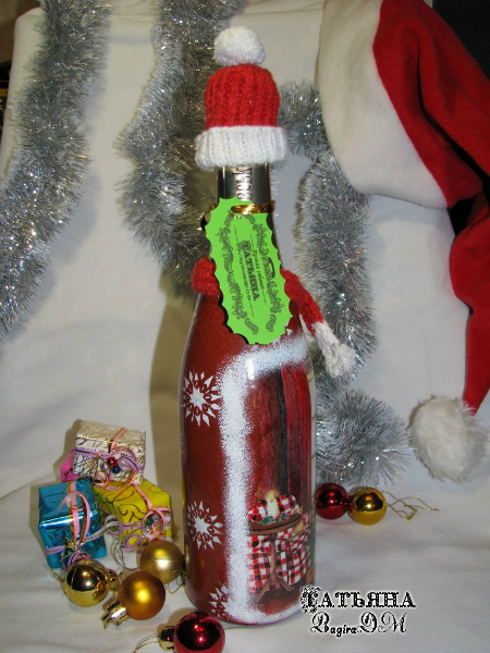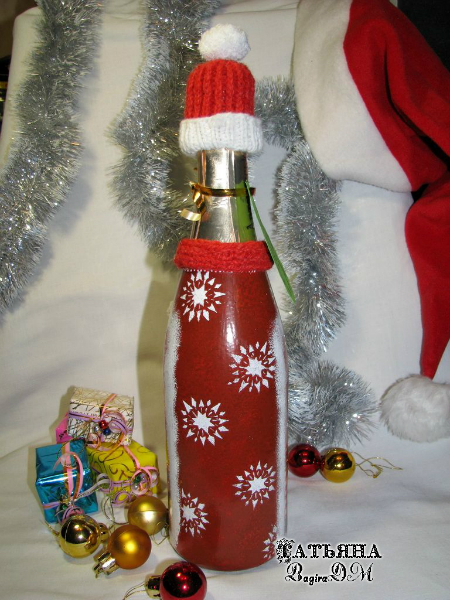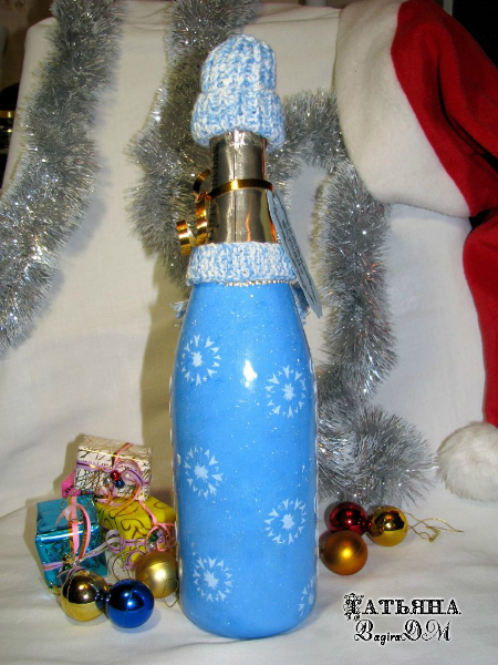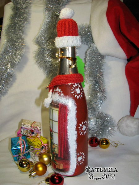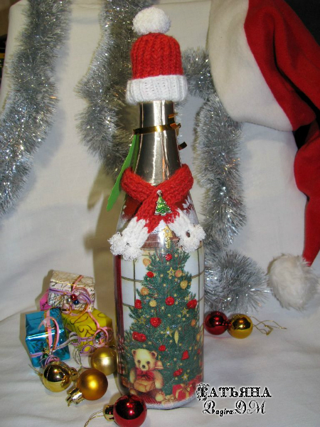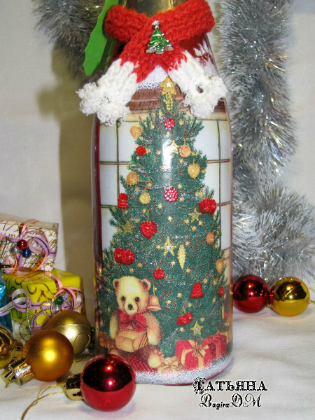 Начнем с новогодних бутылочек для врача и медсестры с детской поликлиники. Сначала у младшей была ветрянка, теперь у старшей, врач и медсестра к нам как на работу - каждый день приходят слушают, меряют, смотрят...Ну вот как не сделать им приятное к новому году? )))