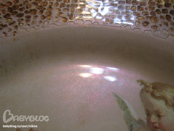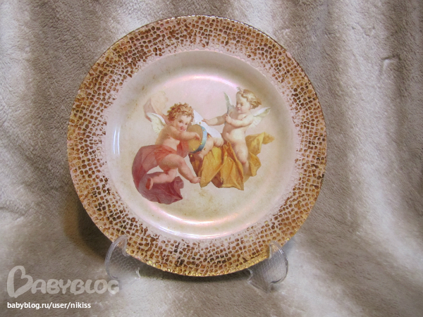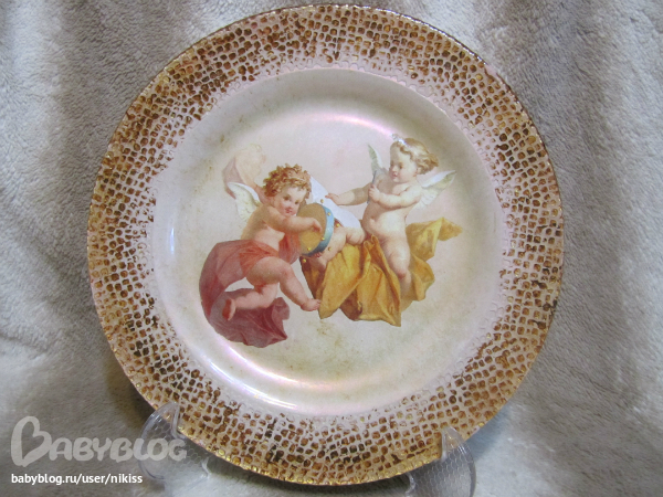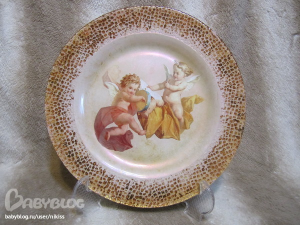Тарелку обезжирила, на выпуклые части нанесла сухой кистью коричневые мазки, немного золотых мазков. Ангелов вырезала, приклеила клеем, сверху покрыла лаком и белой краской. По всей тарелке нанесла пакетом перламутр. Поверх перламутра золото, покраям прошлась интенсивнее. Следующий слой очень бледно-бежевый, потом более темный бежевый. Покрыла лаком с промежуточным прошкуриванием.