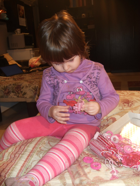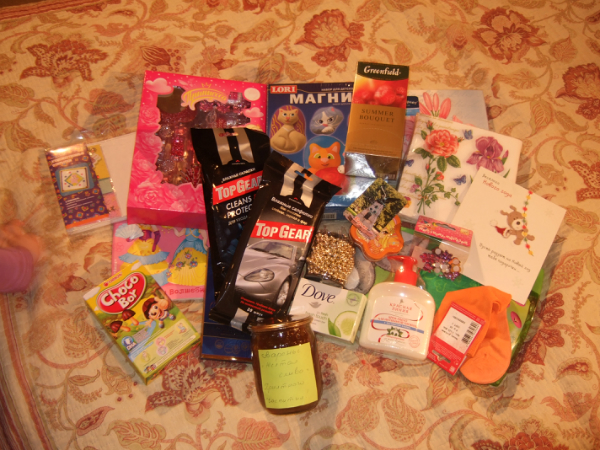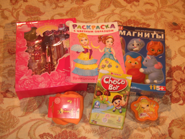 Это Аришкина радость! Супер набор расчесок и заколок! Феечка прям угадала интересы Аришкины! У нас сейчас это как раз в фаворе :) Носочки тут же были одеты! Конфеты открыты :) Только магниты я смогла отвоевать и уговорить открыть потом... но она не перестала с ними ходить в обнимку :)