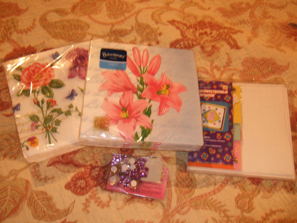 Это для моих рукоделок... Салфеточки, набор для открыточек и прикольные бабочки из камушков... Сорри за фото :)
