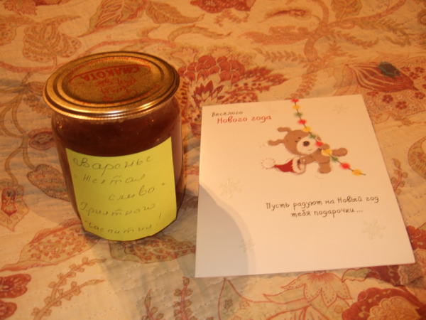 Ну и хит подарка - банка варенья из желтых слив!!! Я когда размотала упаковку просто чуть с дивана не упала увидев банку варенья... Очень приятно и неожиданно получить такой подарок!