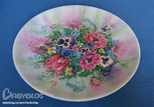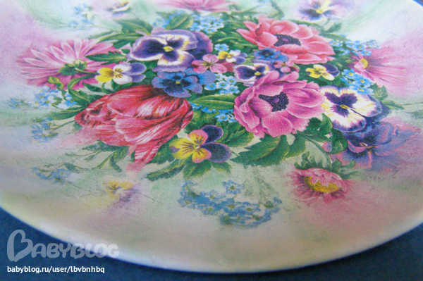 Ход работы: Тарелку немного зашкурила, обезжирила, загрунтовала. Приклеила мотив с помощью файла, потом делала дымку. Сначала акриловой краской, без замедлителя, т.к. нет его, потом немного забелила и сверху еще немного пастелью местами.