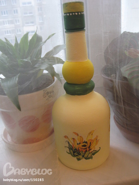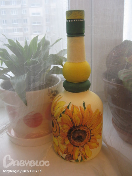 по бутылке с подсолнухами можно вместо красных добавить зеленых (в мишуре), а в остальном путь все так будет