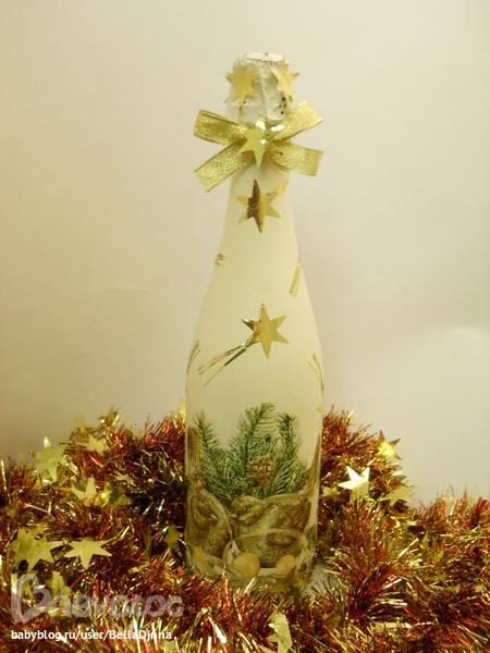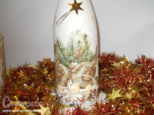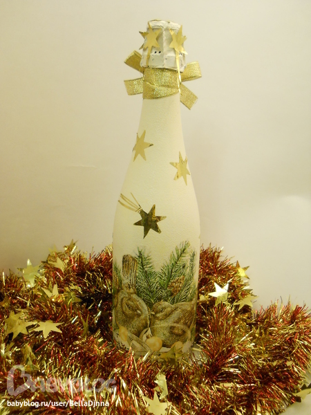 6. Приклеила мишуру по низу и звездочки по верху бутылки.