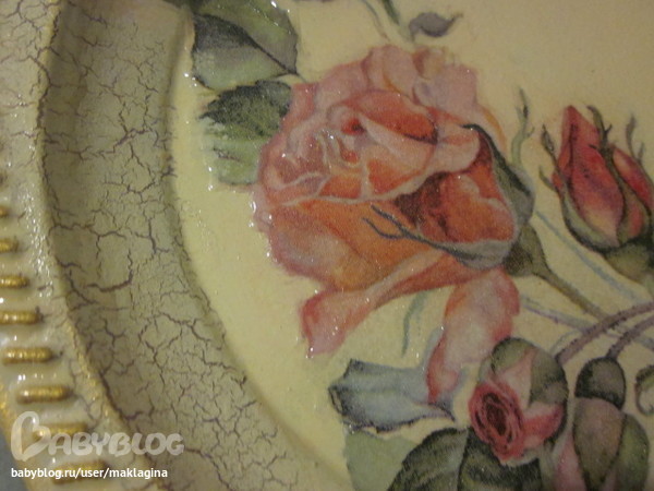 был такой жестяной поднос, я его загрунтовала, по краю нанесла темную краску и сверху кракелюрный лак. Приклеила салфетку. Покрасила бежевым фон. Пастелью сделала тени ,цветы выделила 3д гелем. Немного позолотила край