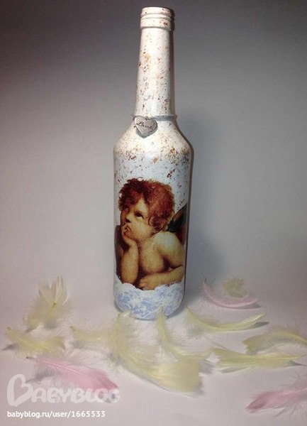 Архив работ к урокамХод работы: сняла этикетки, немного прошкурила бутылочку, обезжирила,нанесла два слоя белой акриловой краской , прошкурила,вырвала мотив , приклеила клеем для декупажа, разбавленным с водой, по контуру картинки подрисовала белой краской фон,прошкурила, пакетом прочпокала поверхность бутылки бронзовой, золотой,серебрянной краской, снизу под ангелочком подрисовала облачко (если похоже), покрыла двумя слоями лака, повесила ленточку с подвеской.