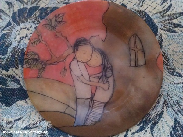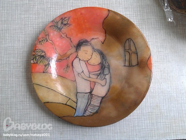 Ход работы: тарелку обезжирила, распечатку покрыла 5 слоями лака и замочила, после отделила верхний слой, сделала 6 надрезов и приклеила распечатку, покрыла 4 слоями лака прошкурила выточки, смешала краски и подкрасила вытачки