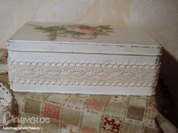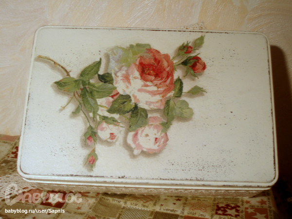 - работы не до конца пролачила, чтоб можно было исправить, и декор на коробочке не закрепляла