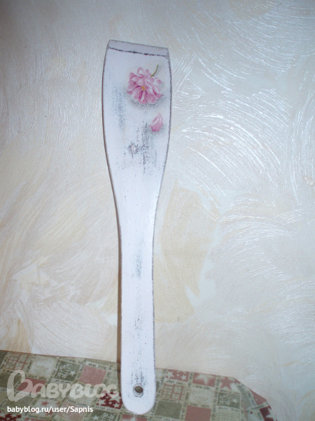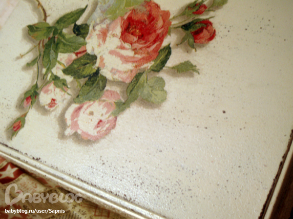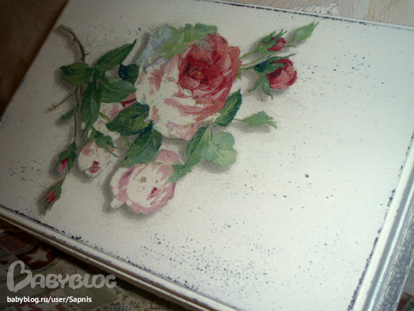 - приклеила мотивы, просушила, прошкурила и покрыла 2-мя слоями лака с просушкой каждого