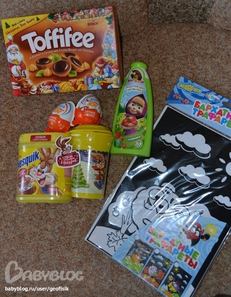 Порадовали абсолютно всю нашу бооооооольшую семью!!!!!!!! А как Софья радовалась подаркам - это что-то!!!!! Даже поверить не могла что вся КУЧА её)))))) Особенный РЕСПЕКТ за Какао с кружечкой!! На сегодня это её любимейший напиток и именно через соломинку!!!!!