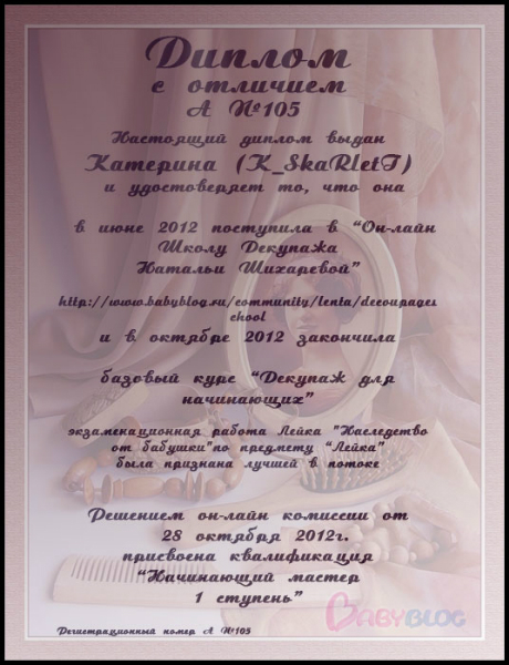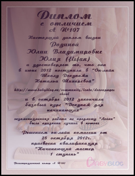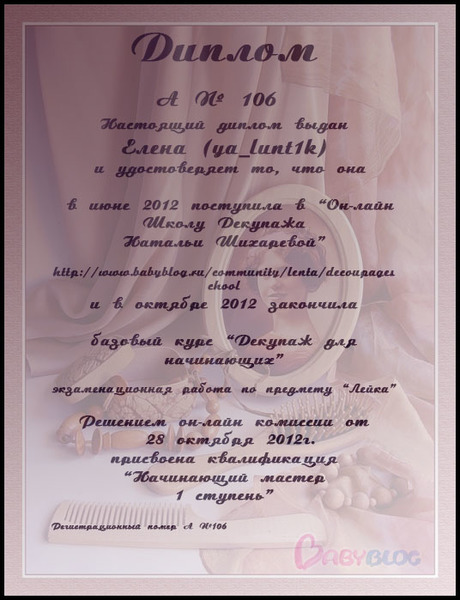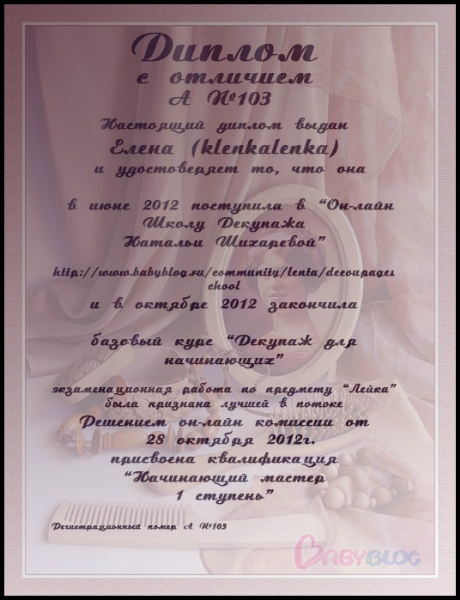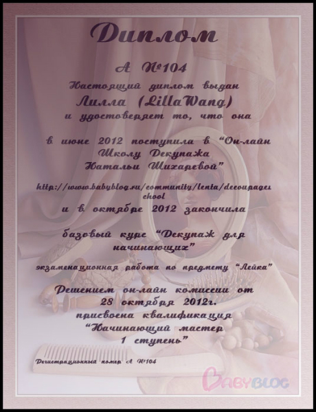 Альбина в ОН-ЛАЙН ШКОЛА ДЕКУПАЖА НАТАЛЬИ ШИХАРЕВОЙ 13 лет Дипломы 15 потока. Экзаменационные работы Дорогие Мастерицы, с выпуском вас поздравляем!!!! Посмотрите еще 20 записей на эту тему Отменить Ответить Катерина О как меня давно не было))) Я и забыла про дипломы! Спасибо большое! 29.01.2013 Ответить Альбина 29.01.2013 Ответить Юлия и только сейчас заметила ,что диплом мой должен быть с отличием... http://www.babyblog.ru/community/post/rukodelie/1789240 25.01.2013 Ответить Альбина Не расстраивайся. Видела сколько сделать пришлось? Сейчас исправим. 25.01.2013 Ответить Юлия Я так и поняла-столько дел,что мозг точно закипит) 25.01.2013 Ответить Альбина Пардон! Спасибо, что предупредила. Приношу свои извинения. До 4 утра 7 видов дипломов....вскипела крыша. 25.01.2013 Ответить Юлия Альбиночка,спасибо огромное)))))))) 29.01.2013 Ответить Альбина 29.01.2013 Ответить Юлия Так приятно,спасибо вам огромное)))))))))))))))))))Альбина вот тут у нас два одинаковых диплопа для Кати ,а для Лены нет... 25.01.2013 Ответить Альбина И Лене сделаем. 25.01.2013 Ответить Юлия 25.01.2013 Ответить Тема и сроки экзамена 19 потока!! Дипломы 16 потока. Чаты Беременных Выберите чат: Январята-2026 Февралята-2026 Мартята-2026 Апрелята-2026 Майчата-2026 Июнята-2026 Июлята-2026 Августята-2026