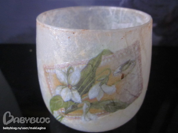 стеклянный подсвешник оклеила рваными кусочками белой салфетки в нахлест 3-5мл. Сделала два слоя. Получавшиеся складочки не разглаживала. Просушила. Покрыла клеем .Фрагменты рисовой бумаги пробовала вырывать, но на изделии оказалось слишком видно. Пришлось вырезать. Приклеила на клей.Красками с разбавителем сделала тени Все покрыла лаком.