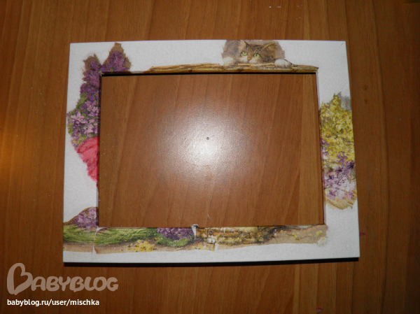 2. Загрунтовала рамку и наклеила мотивы из салфетки как продолжение вышивки. Покрыла лаком. Сошкурила. Еще лак.