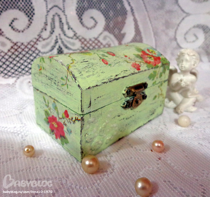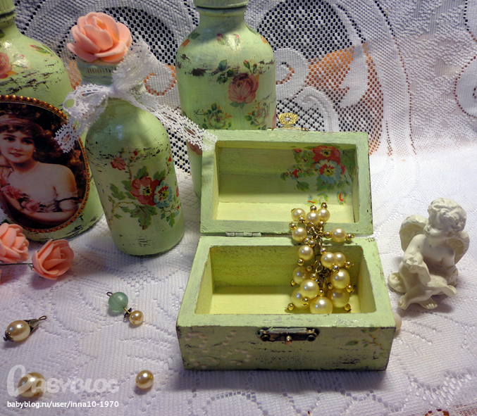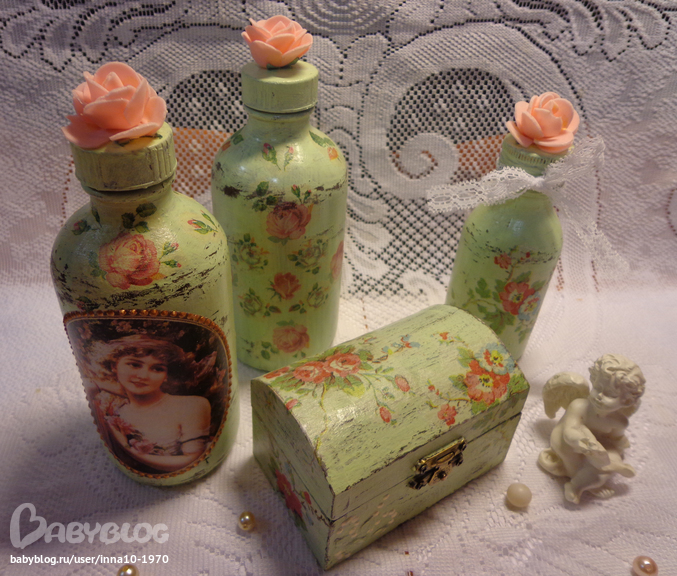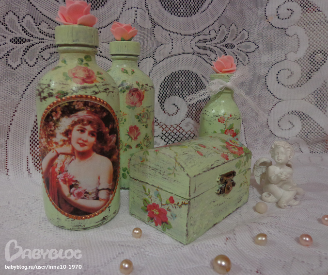 Ход работы: Прошла наждачной бумагой по шкатулке, загрунтовала белой краской, еще раз прошкурила, потом закрасила шкатулку и бутылочки коричневой акриловой краской, после высыхания натерла в некоторых местах свечкой, покрасила акриловой краской цвета - пастель шкатулку и бутылочки, наждачной проявила потертости в тех местах, где проходила свечкой, приклеила цветочные мотивы из салфеток и даму - мотив из декупажной карты, покрыла матовым акриловым лаком 3 раза, прошкурила, еще раз прошла акриловым лаком с добавлением капельки белой краски - забелила цветы, котнуром оформила вокруг дамы, оформила крышечки.