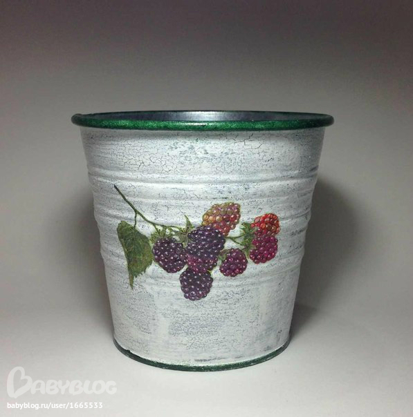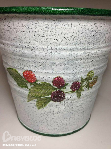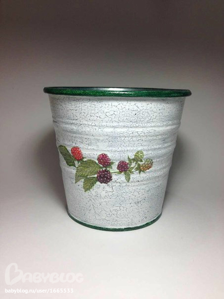 1. Стандартное кашпо из Икеи) Ход работы: обезжирила, загрунтовала белой краской акриловой, нанесла зеленую акриловую краску, после высыхания краски покрыла довольно густым слоем лака для кракелюра. После высыхания лака (примерно 1-1,5 часа) толстой кистью быстрыми движениями в одну сторону нанесла белую акриловую краску, разбавленнную водой. После высыхания воды с двух сторон кашпо приклеила вырезанный из салфетки мотив. Покрыла лаком. Сверху и снизу прочпокала ободок зеленой акриловой краской. Покрыла лаком.