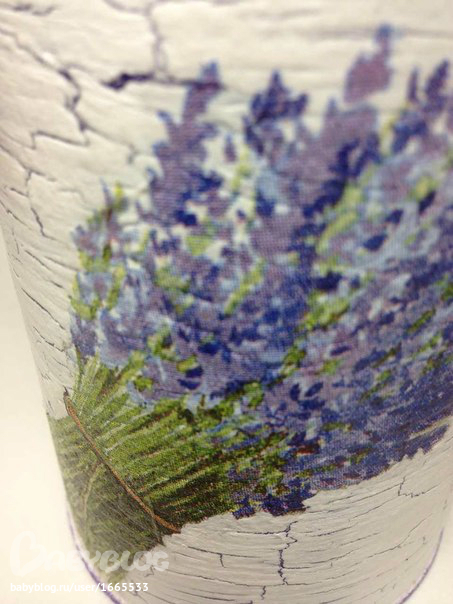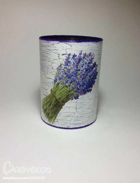 Приклеила заранее вырванный из салфетки мотив. сверху и снизу прочпокала баночку темно-сиреневой краской. покрыла два раза лаком на водной основе.