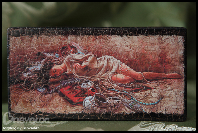 6) нанесла 2 шаг кракелюра, получившиеся трещинки затерла золотым порошком.
