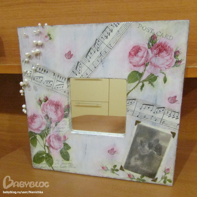 Приклеила салфеточные мотивы, покрыла лаком, пошкурила.
