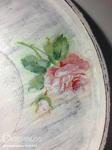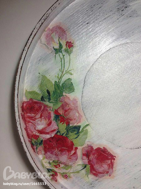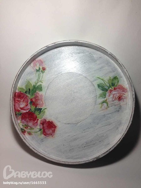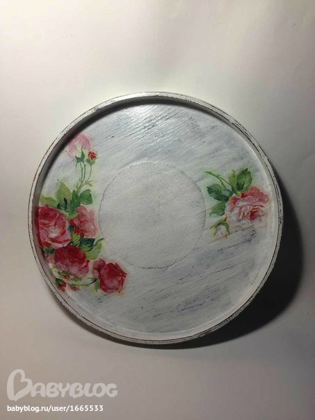 Ход работы: зашкурила поднос, покрыла в два слоя коричневой краской, после высыхания потерла некоторые места свечкой. Покрыла белой акриловой краской в два слоя. Шкуркой аккуратно прошлась по бортику подноса и внутри, снимая аккуратно верхний слой краски. Стряхнула пыль. Методом файла нанесла на поднос заранее вырванные мотивы роз из салфетки. Покрыла клеем ПВА. После высыхания клея покрыла два раза лаком на водной основе. Сухой пастелью сделала дымку вокруг рисунка. Сбрызнула лаком для волос. После покрыла лаком на водной основе в два слоя.