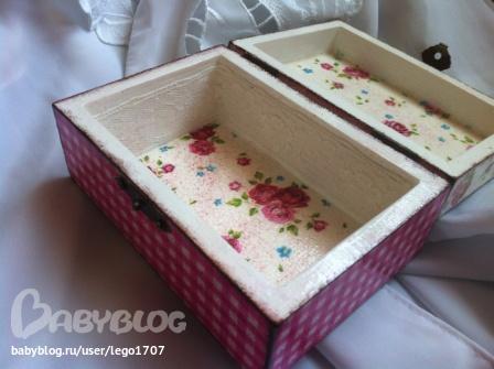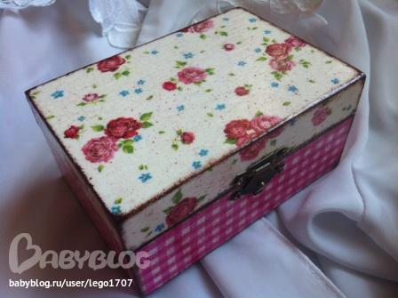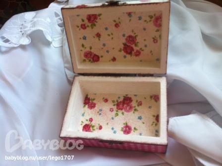 Ход работы: Шкурка и грунт шкатулки. Приклеила мотивы. Покрыла лаком, ошкурила. Крышку покрыла 1 шагом кракелюра стамперия, через 30 мин - 2 шагом, через сутки втерла в трещины коричневые тени ля век. 2 слоя лака. Сделала набрызги коричневым и бордовым снаружи и внутри шкатулки. лак. Начпокала коричневым на сгибах шкатулки. Внутри шкатулку оформила по совету Натальи - наклеила по бортику кружева. Покрыла финишным лаком 7 слоев. Прикрутила фурнитуру.