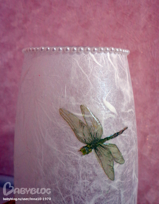 - оформила горлышко бусинками, выделила стрекозу объемным гелем и глазки стрекозы - бисером, серединки цветов - контуром