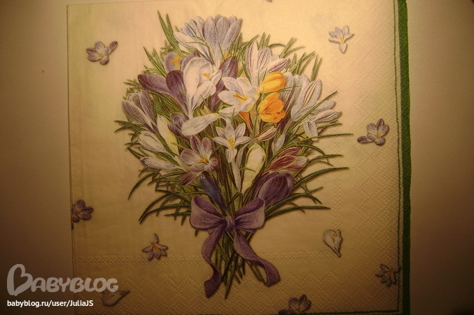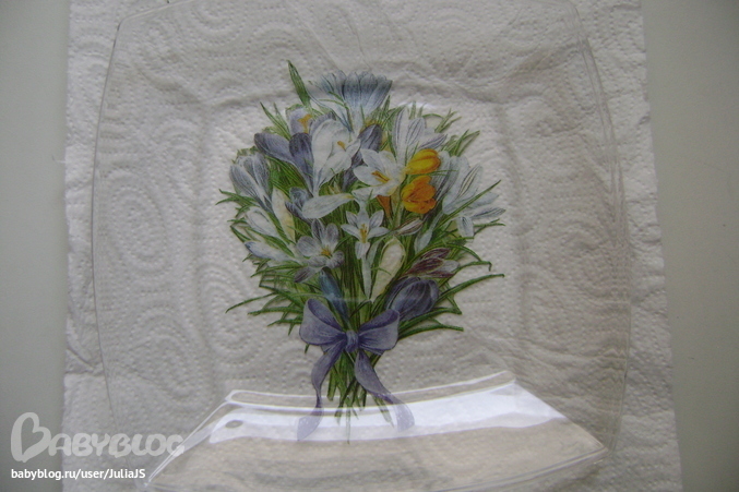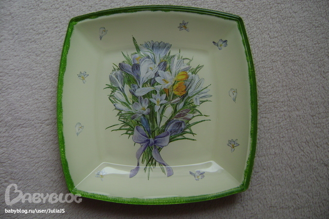 Ход работы: обезжирила тарелочку, вырезала мотив из салфетки, приклеила методом файла узор на тарелку, покрыла клеем для декупажа, потом вырезала маленькие цветочки и тоже приклеила их, дорисовала веточки и окантовку на тарелке, покрыла букет и цветочки белой краской, затем намешала основной тон - слоновая кость (совсем бледный) и покрыла двумя слоями всю тарелку с просушкой каждого слоя. Затем навела зеленую краску, как окантовка на тарелке, затем покрыла двумя слоями тарелку, с просушкой каждого, затем покрыла тремя слоями лака.