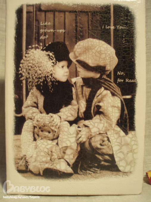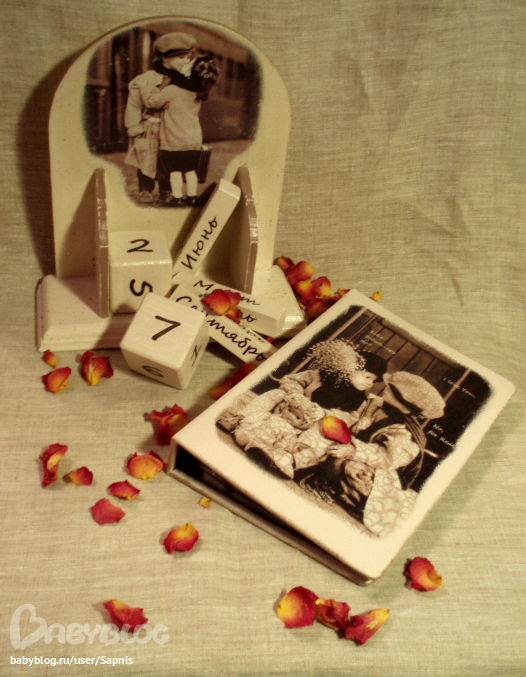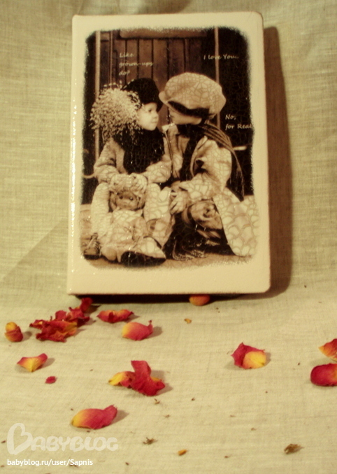 - вырвала и приклеила мотив из декупажной карты, на бруски наклеена распечатка, истончённая при помощи лака и воды