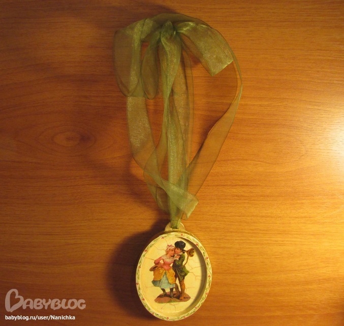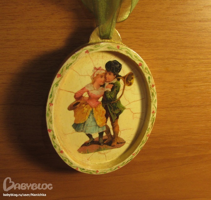 Заготовку пошкурила и загрунтовала, сделала фон, вырезала мотив из переводной декупажной карты, перевела на медальон, покрыла все лаком. На бортике нарисовала цветочный узор, покрыла лаком. Покрасила сзади золотой краской, чуть-чуть "испачкала" бортик коричнево-золотой краской. На внутреннюю часть нанесла шеллак, оставила сушиться, на липкий еще шеллак налила гуммиарабик и втирала его пальцем минут 5, пока поверхность не стала ровной, оставила все сушиться. Медной пудрой затерла трещины, смыла под струей воды излишки, оставила сушиться. Затем всю работу покрыла слоем шеллака.