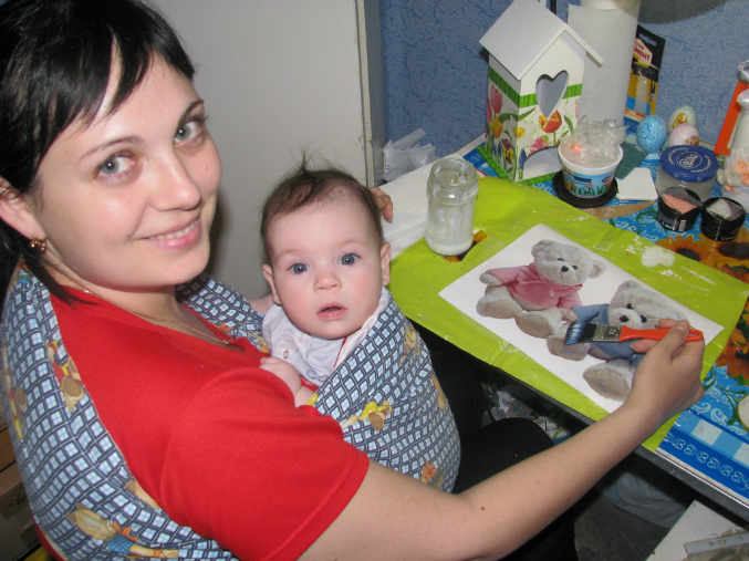 супер!!! :) у меня мелкий тож ручной, процес деупажа примерно так: мальчишки за столиком с 2 сторон, шкурят-красят, я с малым на руках (ну если повезет то рядом лежит на коврике) быстро-быстро "творю"...