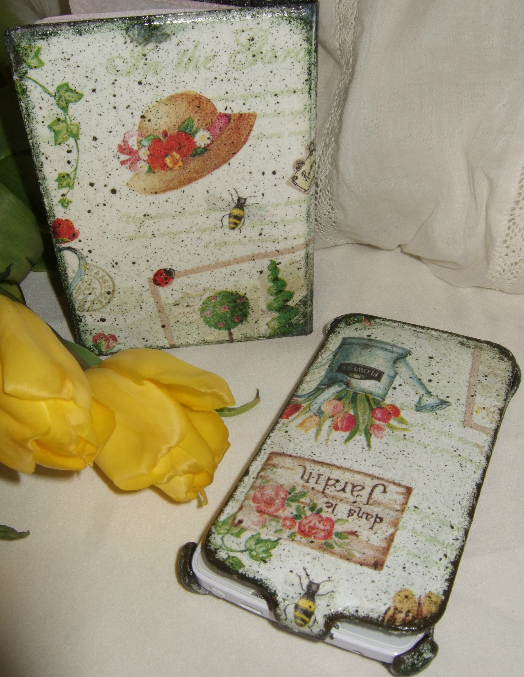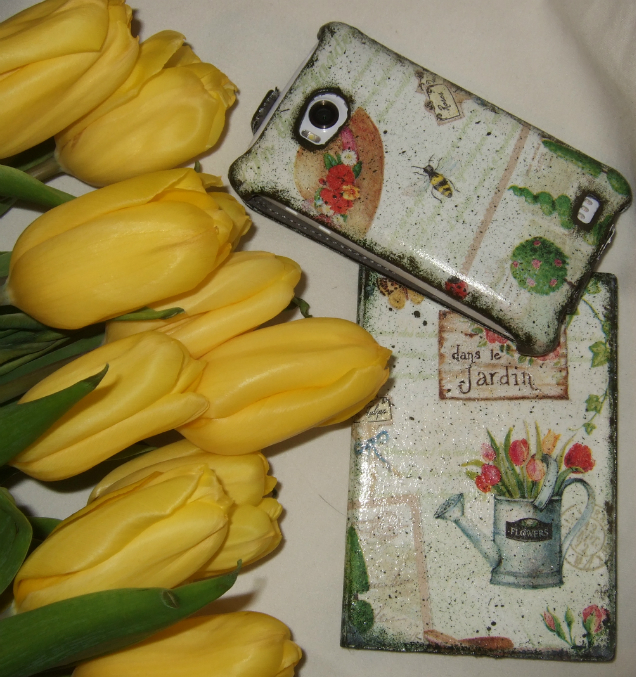 Были черненький чехол на телефон и мрачноватая обложка на паспорт. Но после счастливых часов в декупажной лихорадке у меня вот что вышло
