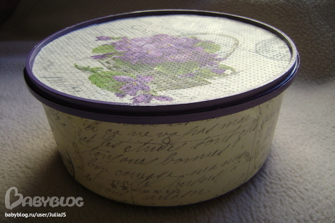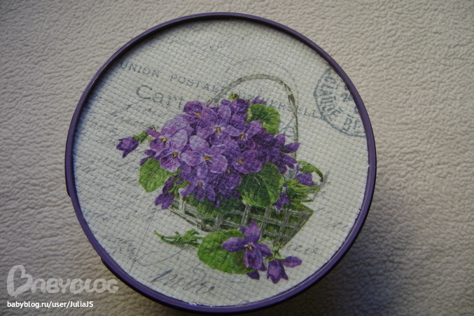 Ход работы: сделала шаблон круга - внутри крышки углубление, вырезала по шаблону канву, приклеила салфетку (надо сказать, что это удалось мне раза с 8!! Все время салфетка рвалась), подождала, пока высохнет, проколола дырочки. Отшкурила низ коробочки (как трудно работать с пластмассой), покрыла тремя слоями акриловой краски, с просушкой каждого, порвала салфетку, где буковки, наклеила на коробочку, сделала обводку сиреневого цвета, покрыла тремя слоями лака, пошкурила, покрыла еще одним слоем лака. Крышку отшкурила, покрыла двумя слоями акриловой краски, с просушкой каждого. Приклеила канву. Заклеила канву малярным скотчем, покрасила ободок на крышке сиреневой акриловой краской. Низ коробочки мне не совсем нравится, как получился, работать с канвой было интересно, а вот с пластмассовой коробочкой - не очень.