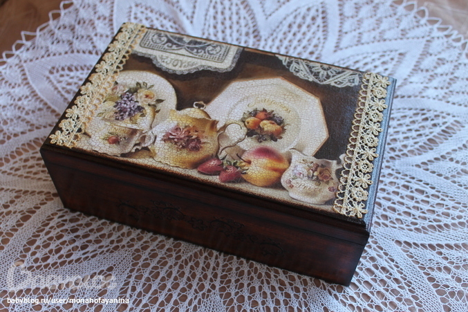 Возникли небольшие проблемы с оформлением крышки...Сама заготовка большая,а я смогла найти подходящий рисунок на декупажной карте только размером уже (распечатки пока никак не могу научиться печатать на своём горе-принтере).Так и пришла идея дополнительного оформления при помощи кружева,тонированного в чае.И карту в этот раз клеила прямо на поверхность дерева,без грунтовки...Сама заготовка была из отбеленной древесины,вот и решила попробовать сделать так.
