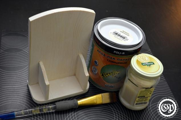 Дерево покрываем морилкой подходящего под задумку цвета. У меня водная Морилка просто белого цвета. В отличии от краски морилка не закрывает рисунок древесных волокон, а наоборот делает его более явным.
