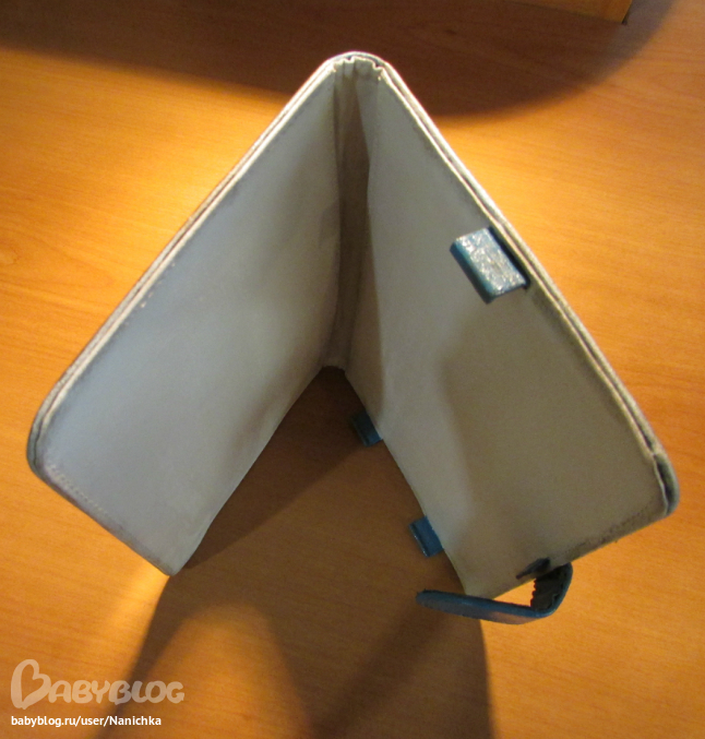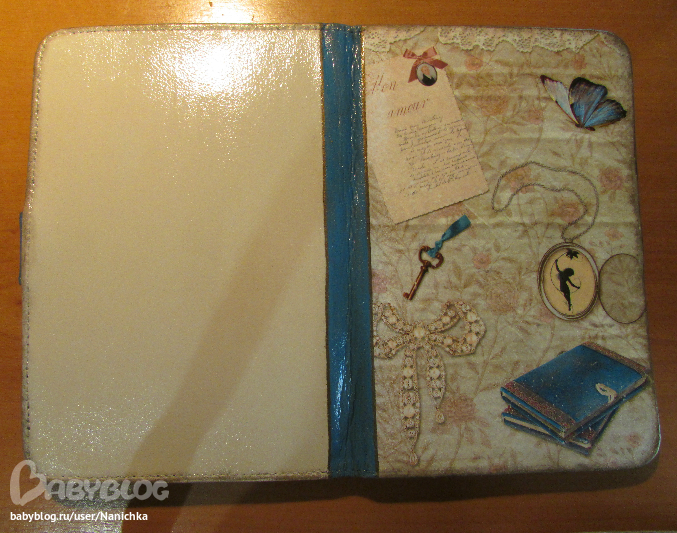 Обложку обезжирила, пошкурила, загрунтовала, приклеила мотив на переднюю часть обложки, на задней части оболжки краской сделала светлый фон, намешала голубую краску в тон книжкам и бабочке, прокрасила ей застежку и "корешок", выделила корешок бронзовой краской, покрыла все двумя слоями стекловидного лака. Внутреннюю часть прокрасила светлым фоном, голубым цветом выделила держатели для книжки. Получилась вот такая обложка для электроннойкниги для сестры: она уже давно с нетерпением ждала этого моего урока - просила сделать ей обложку, чтобы она была "простая, универсальная, но в то же время в романтическом стиле". Надеюсь, что получилось.