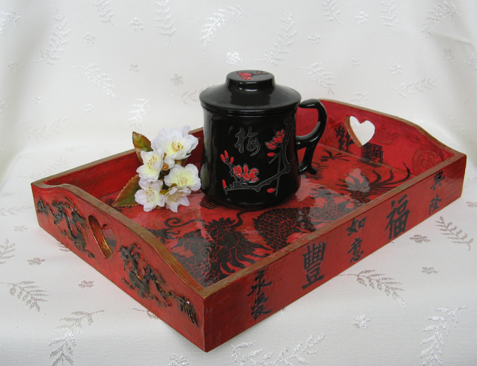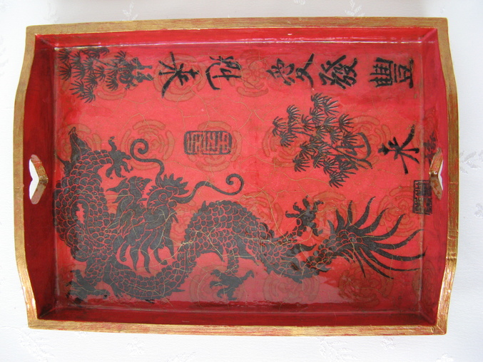 - наклеила иероглифы на бока подноса , дракончиков на торцы