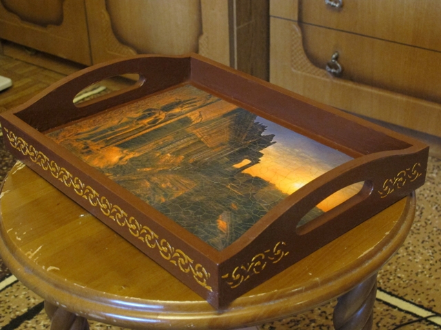 1. Пошкурила и загрунтовала поднос. Сдела распечатку, покрыла лаком и оставила на сутки сушить.