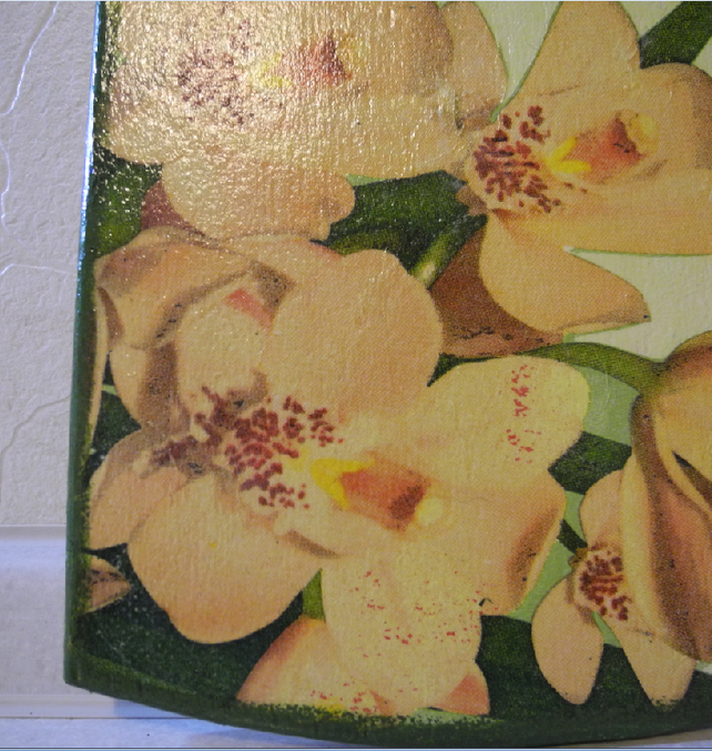 видимо с окантовкой совсем плохо у темя получилось с цветом. Тк салфетка приклеена ровно по доске. У меня салфетка не на всю доску. она закончилась примерно на 1/4 от всей поверхности доски и остальную часть я дорисовала. Может не совсем это получилось удачно, тк я уже писала , что дорисовывать пока мало получается. Возможно нужно было выбрать более простой мотив. Что бы работа краской было меньше.
