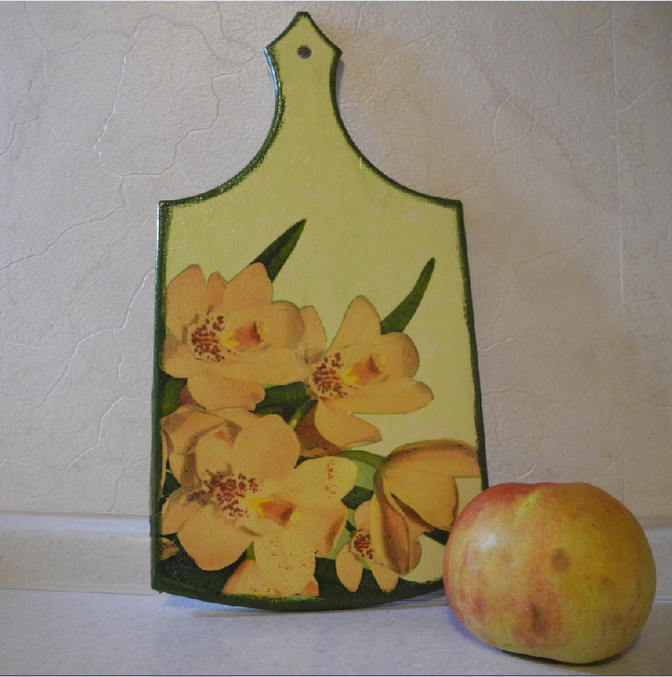 Сделала фон доски зелено-желтый с помощью губки "прочпокала" оставляя немного белых пятен. Вырезала рисунок. Приклеела через файл, сбрызнув водой с солью. Рисунок смогла приклееть только со второго раза, тк салфетка оказалась очень тонкой и рвалась. Да и на второй раз пришлось повозиться. Кое где салфетка на галзах расползалась((((( Нанесла клей ПВА .Покрыла слоем лака.