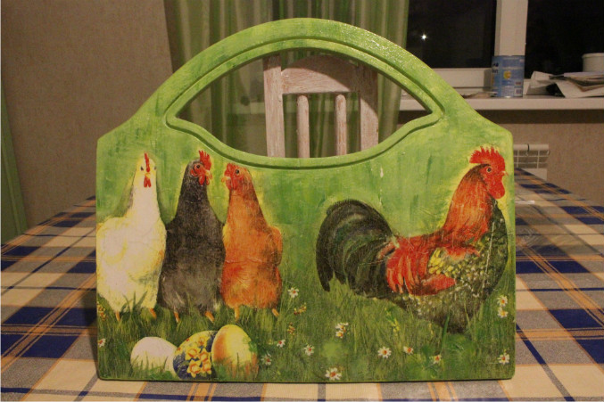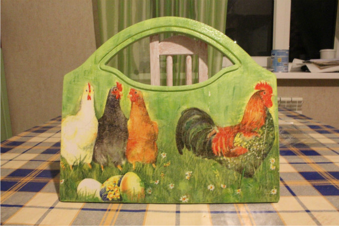 В ходе работы выяснила для себя, что не нужно было брать такой большой фрагмент для первого раза... Лучше бы было, если рисунок был поменьше. Но уж так меня подкупил пасхальный сюжет на салфетке, что захотелось его пустить в дело! И еще не решила, буду ли использовать эту досочку по прямому назначению, поэтому водостойким лаком пока не покрыла и маслом не пропитывала.