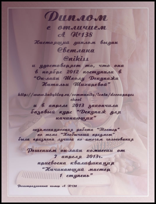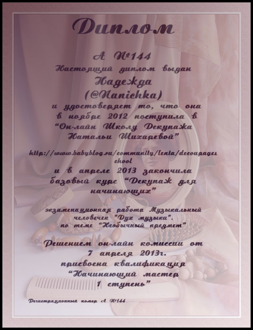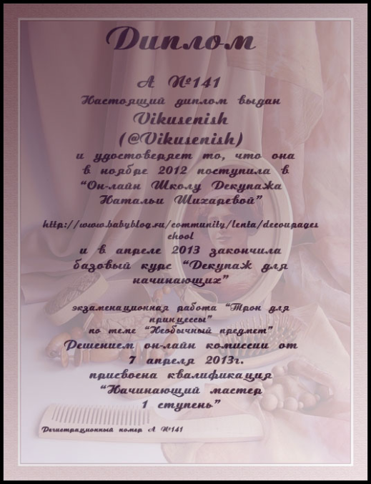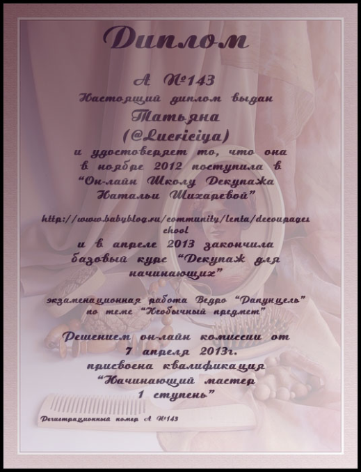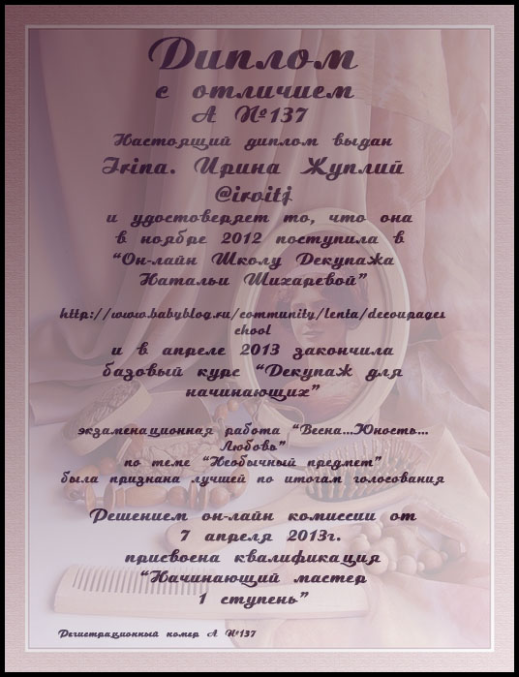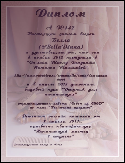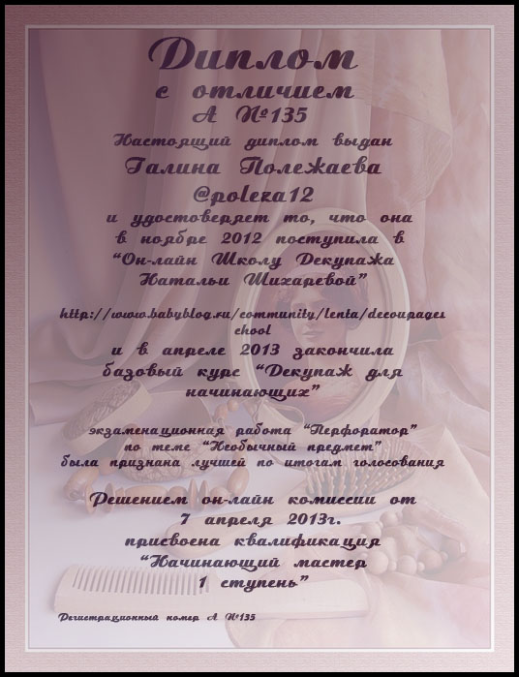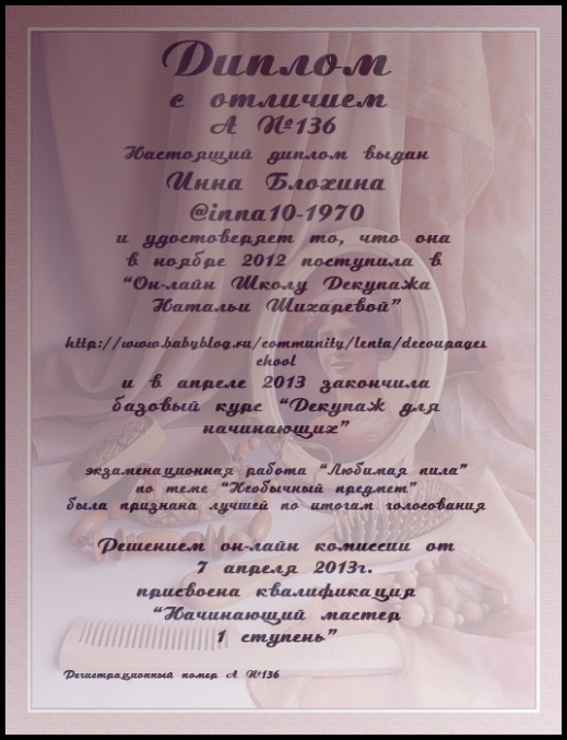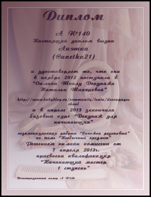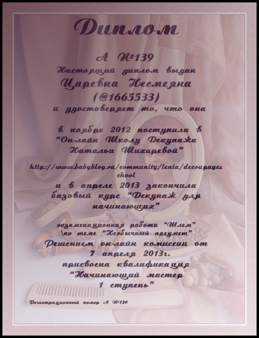 Альбина в ОН-ЛАЙН ШКОЛА ДЕКУПАЖА НАТАЛЬИ ШИХАРЕВОЙ 13 лет Дипломы 21 потока Экзаменационные работы Посмотрите еще 20 записей на эту тему Отменить Ответить ЮлияЮ Ой, пропустила пост. Большое спасибо всем преподавателям и девочкам-декупажницам за ценные знания, отличную доброжелательную атмосферу в школе!!! 20.04.2013 Ответить Белла Спасибо, спасибо. спасибо!! А как забрать домой?? 17.04.2013 Ответить Альбина Рады, что вам нравится!!! Скопируйте себе свой дипломчик, а потом можете и в дневнике, и где угодно им хвастать! 17.04.2013 Ответить Результаты экзамена 21 потока!! Тема и сроки экзамена 22 потока! Чаты Беременных Выберите чат: Январята-2026 Февралята-2026 Мартята-2026 Апрелята-2026 Майчата-2026 Июнята-2026 Июлята-2026 Августята-2026