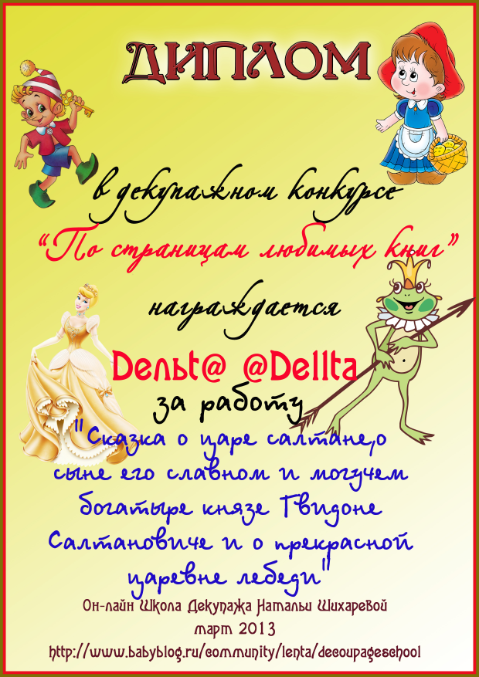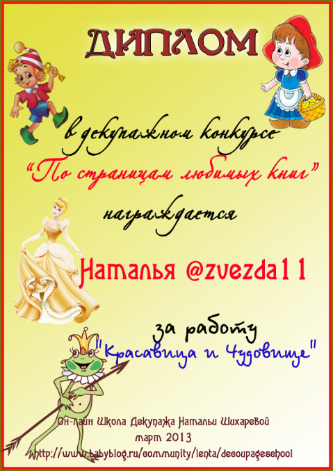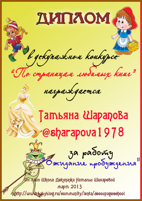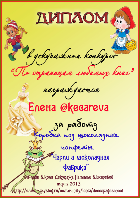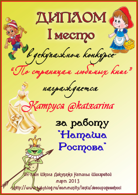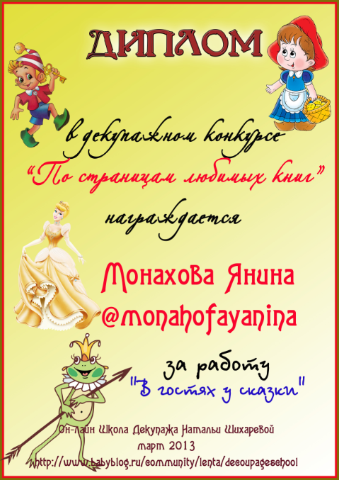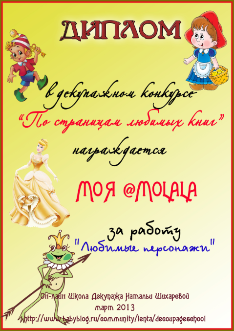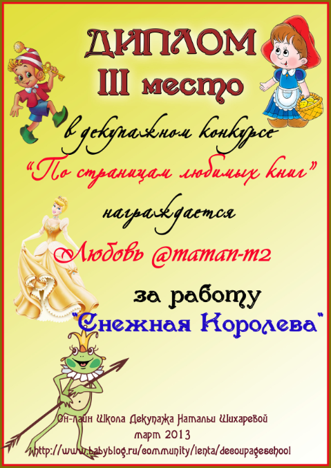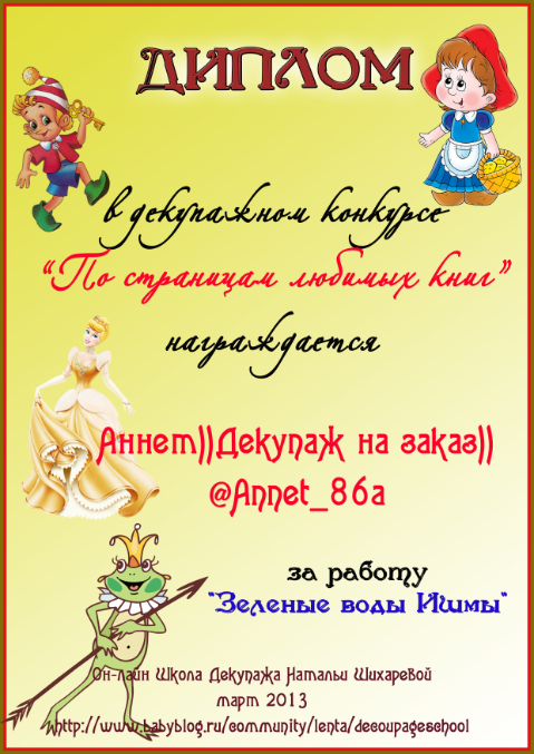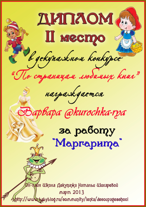 Альбина в ОН-ЛАЙН ШКОЛА ДЕКУПАЖА НАТАЛЬИ ШИХАРЕВОЙ 13 лет Диплом по итогам конкурса "По страницам любимых книг" Конкурсные работы Посмотрите еще 20 записей на эту тему Отменить Ответить Варвара Такие милые дипломы, спасибо большое!!! 18.04.2013 Ответить Альбина 18.04.2013 Ответить Катруся спасибо большое за диплом! 16.04.2013 Ответить Альбина 18.04.2013 Ответить Мой второй приз:) Декупажный конкурс "Маленькая страна" (все, что связано с детьми) Чаты Беременных Выберите чат: Январята-2026 Февралята-2026 Мартята-2026 Апрелята-2026 Майчата-2026 Июнята-2026 Июлята-2026 Августята-2026