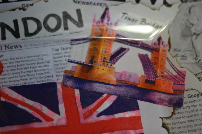 4. Истончила скотчем распечатку с текстом английской газеты, нарвала кусочки, обожгла, затем приклеила к тарелке.