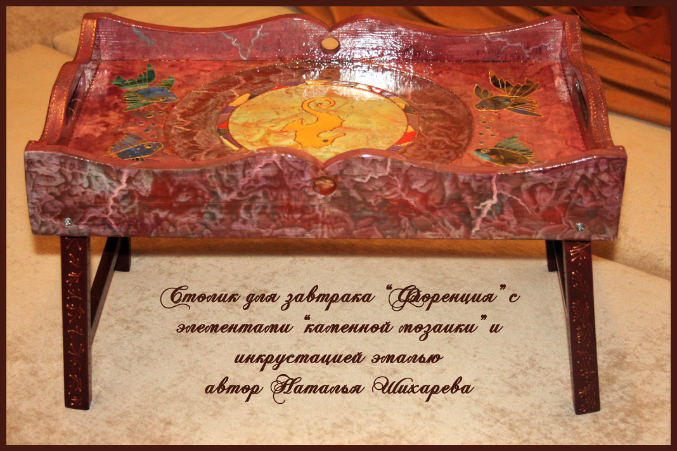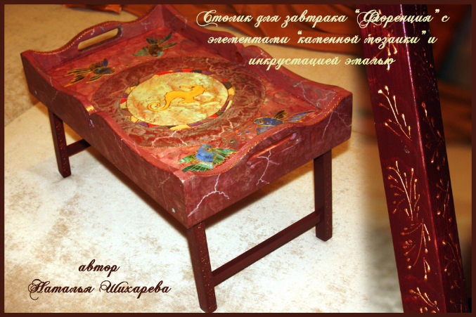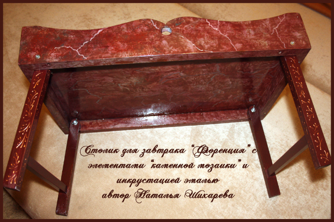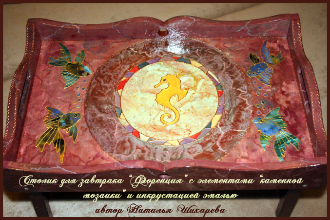 Наши шедеврыВ этот раз столик для завтрака захотели не зеленый мраморный с малахитовыми вставками бабочками как я уже делала и показывала в дневнике, а под цвет флорентийского собора, инкрустировать нужно было слоистыми и поделочными камнями, выложить мозаикой их в виде рыбок + украсить все декоративной эмалью. Ножки расписала в ручную, чтобы они были ажурными. Столик под камень, особый дорогой сорт мрамора. Вся задумка моя, исполнение тоже, от заказцичы было направление в цвете флорентийского собора. Ножки столика складываются. Очень удобно для романтического завтрака) в постель)
