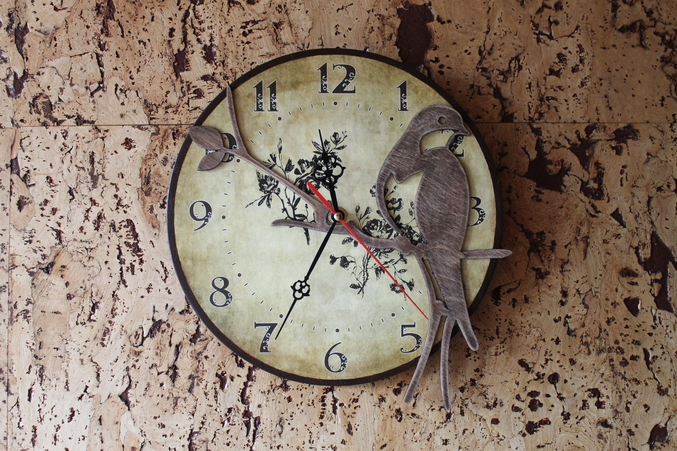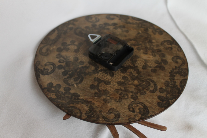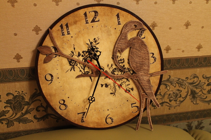 Материалы: заготовка из фанеры,акриловые краски,морилка, акриловый лак, декупажная карта,салфетка,ПВА,универсальный клей,битумный лак,часовой механизм